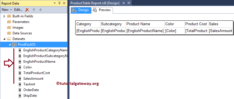 为了说明可用的格式选项,我们将使用下面显示的数据集。请参考“共享数据源”和“数据集”文章,以了解创建用于此 SSRS 报表的数据源和数据集的步骤。