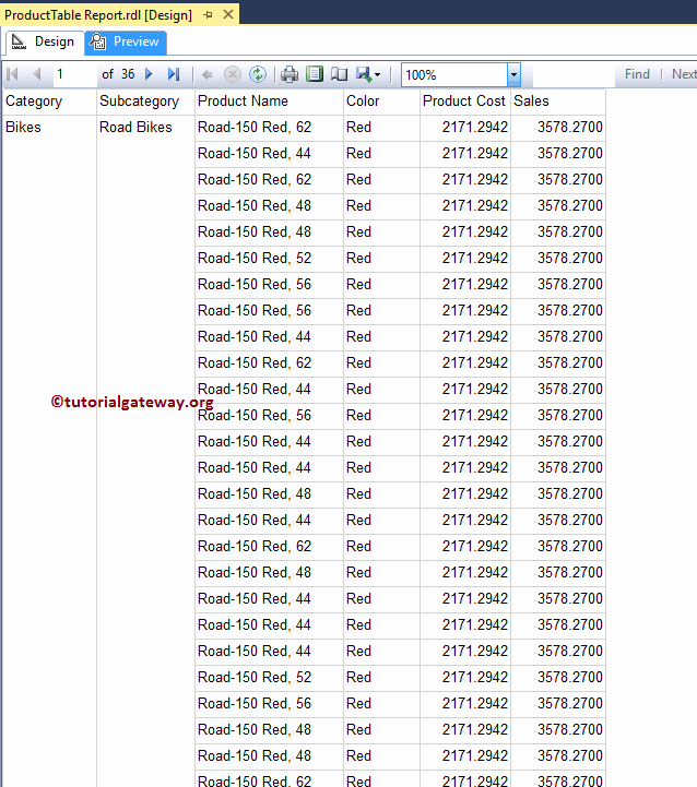 如果您观察到下面的屏幕截图,它只是一个普通的报表,包含产品类别名称(主组)、产品子类别名称(子组)、产品名称、颜色、总产品成本和销售额列作为详细信息。