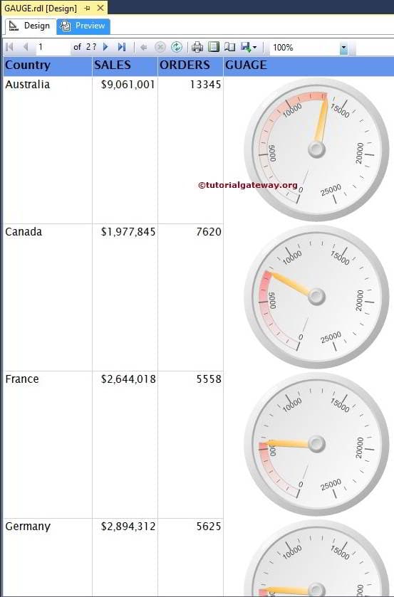 为了解释可用的 SSRS 仪表格式选项,我们将使用下面显示的报表。请参考仪表文章,以了解我们用于此SSRS报表的数据源和数据集。