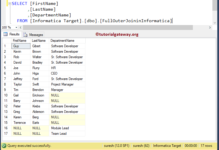 让我们打开 SQL Server Management Studio,检查我们是否已成功使用 Joiner 转换在 Informatica 中执行了全外连接。