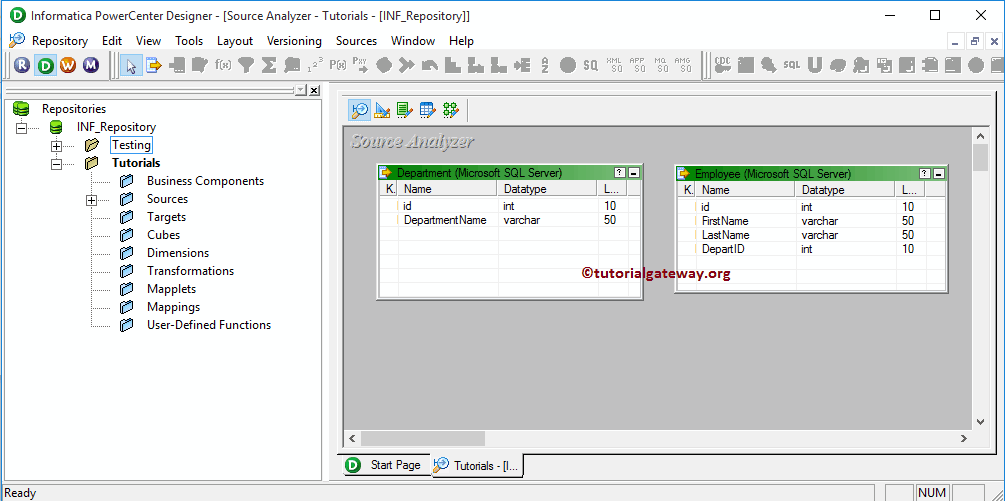 成功连接后,请导航至 源分析器 并定义您的源。在此 Informatica 全外连接示例中,我们使用 SQL Server 数据库中的 Department 和 Employee 表作为我们的源定义。