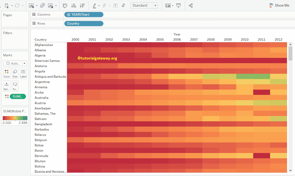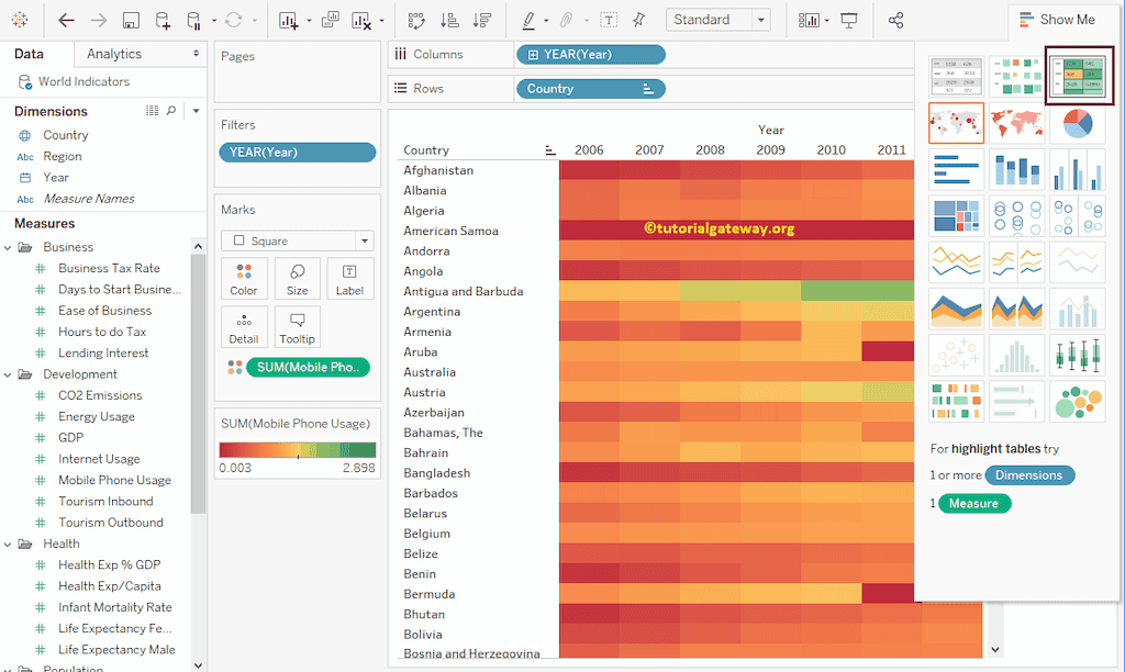 现在您可以看到具有不同颜色组合的 Tableau 高亮表格。但是,排除 2000 年至 2005 年的年份似乎更好,因为该时期没有足够的数据可供显示。