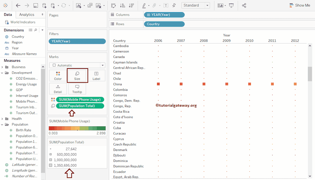 我们可以调整大小,而不是用颜色填充整个高亮表格块。为此,请将“总人口”从“度量”区域拖到“标记”架的“大小”字段。可以看到,每个块的大小都基于人口显示。