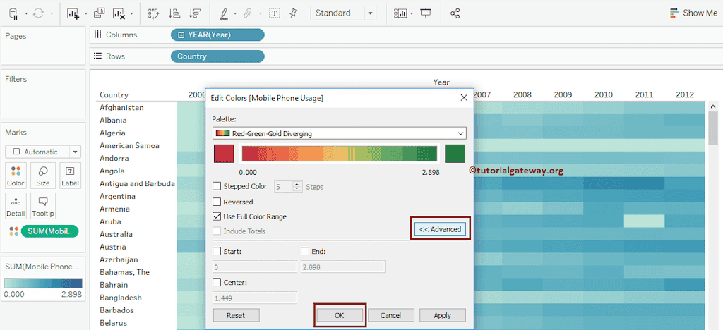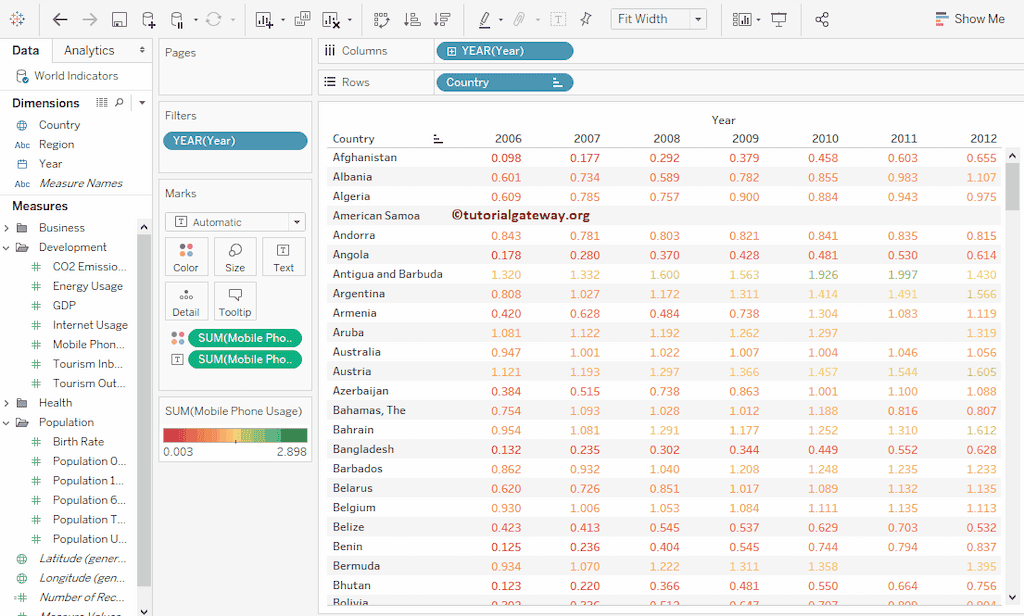 接下来,将“手机使用量”字段从“度量”区域拖放到“标记”架的“颜色”字段。从下面的屏幕截图中,您可以看到高亮表格。我将更改颜色调整字段的位置。