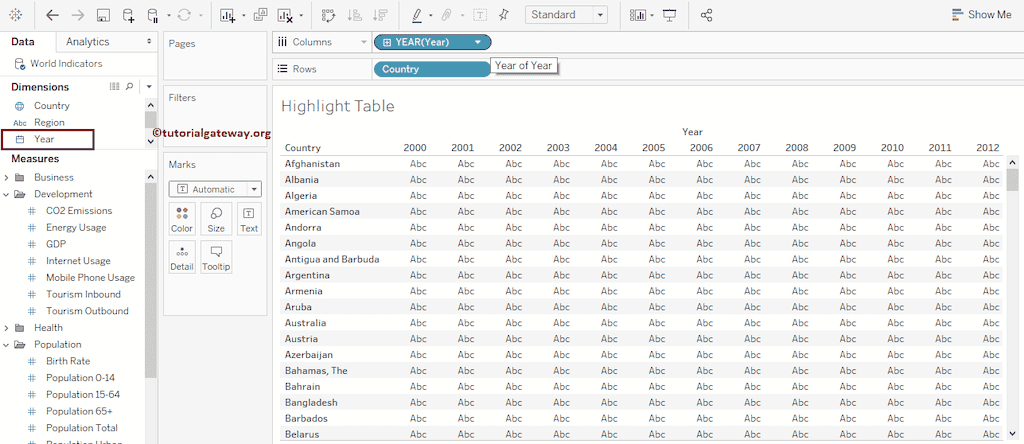 要手动创建 Tableau 高亮表格,请将“国家”字段从“维度”区域拖放到“行”架上。拖动后,将生成一个文本标签,如下所示。