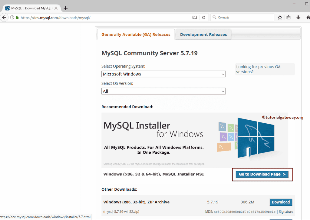 使用“Select OS version”下拉框选择版本(32 位或 64 位)。目前,我们选择“All”(32 位和 64 位)。接下来,单击“Go to MySQL Download Page”按钮,如下图所示。