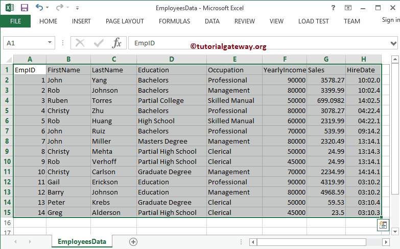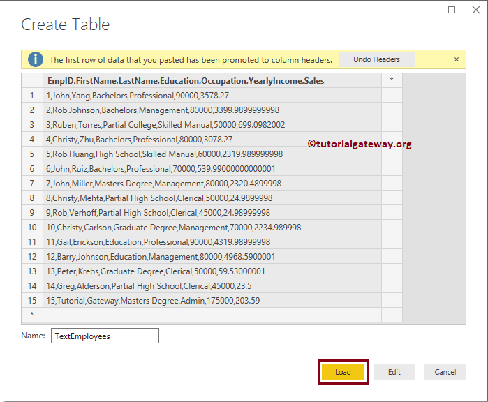 将其粘贴到“创建表”窗口(Ctrl + C 和 Ctrl + V)。请注意,它会自动检测列标题。我将表重命名为“ExcelEmployee”,然后单击“加载”按钮。