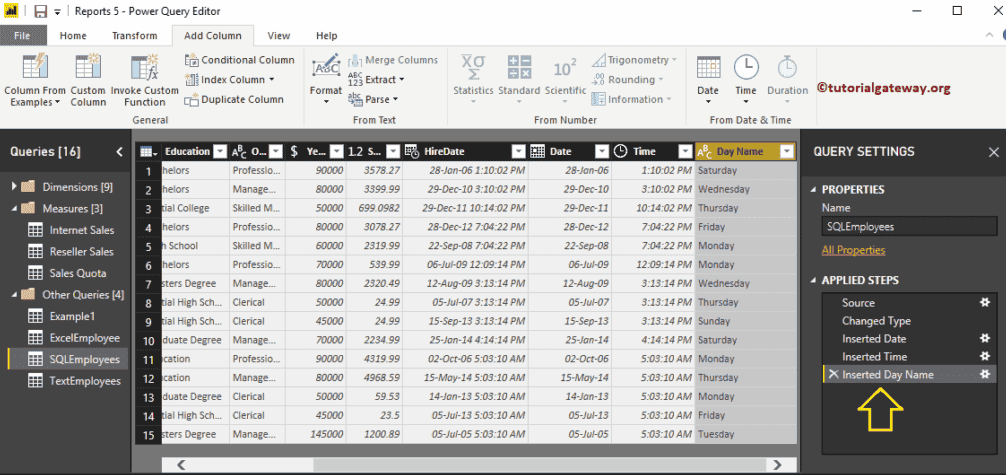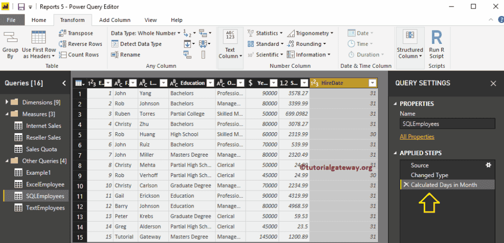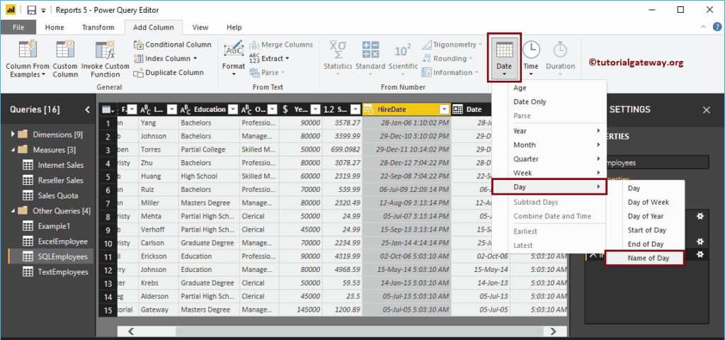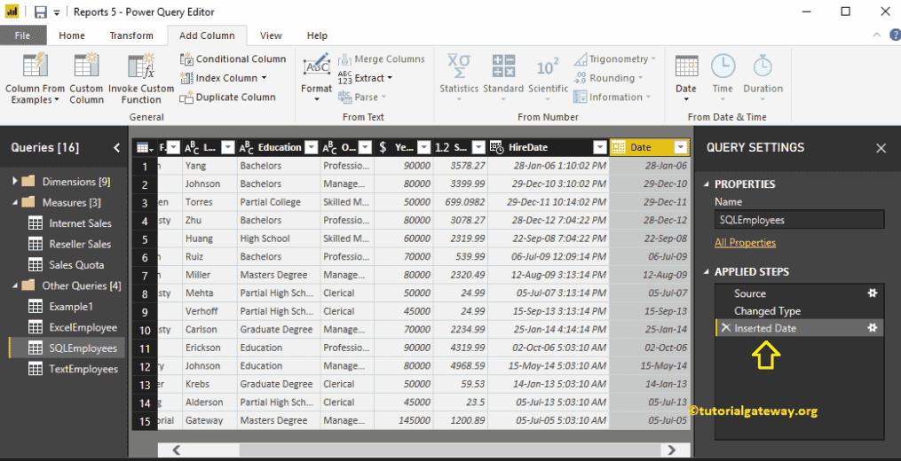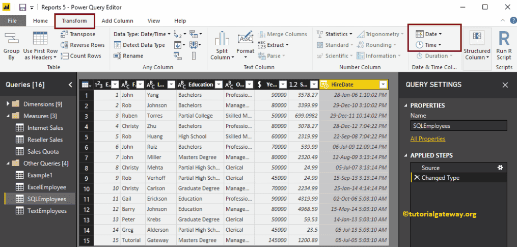 单击“编辑查询”选项会打开一个名为 Power Query 编辑器的新窗口。从下面的截图中,您可以看到 HireDate 列。为了演示日期格式化选项,我们将使用此列。
