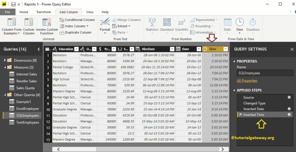 现在您可以看到新列显示了 Hire date 中的时间。