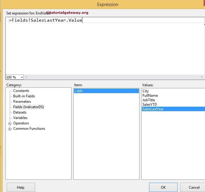 从上面的屏幕截图中,我们对红色指示器的起始值 0 感到满意。但是,我们需要更改结束值。因此,我们选择“结束值”文本框旁边的 fx 按钮并输入以下表达式。