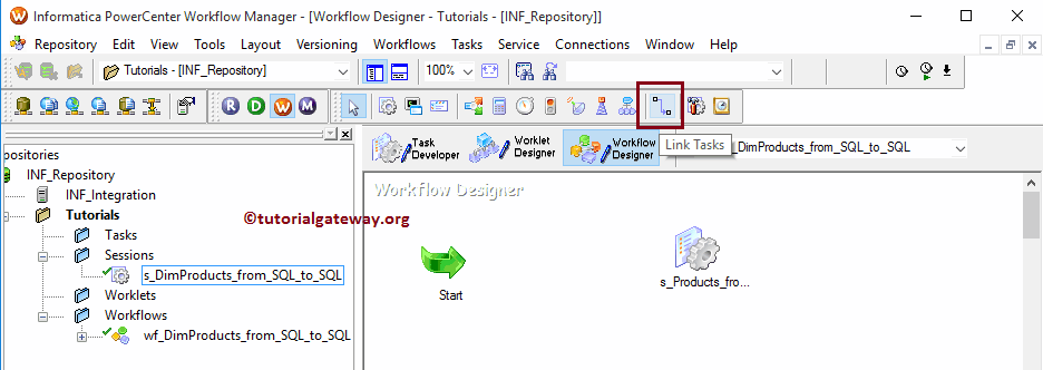 创建Informatica工作流后,您可以创建非可重用会话。或者,您可以使用已创建的可重用会话。为了演示这两种情况,我们首先拖动已创建的可重用会话 s_DimProducts。请参考可重用会话文章以了解其中涉及的步骤。