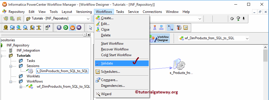 完成工作流的创建后,在使用它之前,我们需要验证任务。为此,请导航到“Informatica工作流”菜单并选择“验证”选项。