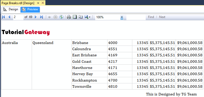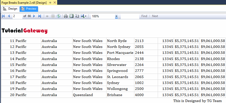 - 在每个组实例之间:如果您选择此选项,则在新组开始时将打破页面。例如,澳大利亚的昆士兰州是一个新的组实例,因此它将在该点打破页面,并在新页面上显示属于昆士兰州的所有记录。