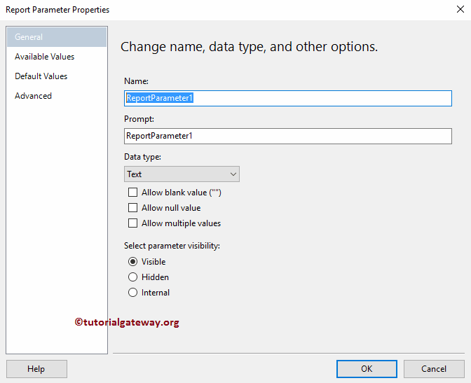 上面的 SSRS 分页符报表符合我们的要求,但让我隐藏该参数。为此,请右键单击参数将打开“报表参数属性”。在此,请选择“参数可见性”选项将其设置为“隐藏”。