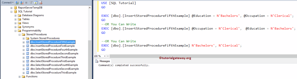 EXEC [dbo].[InsertStoredProcedureFifthExample] @Education = N'Bachelors', @Occupation = N'Clerical'; GO --OR You Can Write EXEC [dbo].[InsertStoredProcedureFifthExample] @Occupation = N'Clerical', @Education = N'Bachelors'; GO --OR You Can Write EXEC [dbo].[InsertStoredProcedureFifthExample] N'Bachelors', N'Clerical'; GO