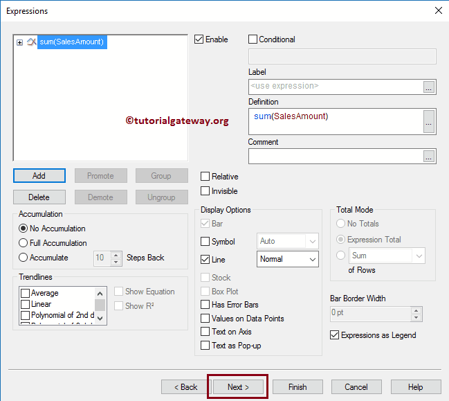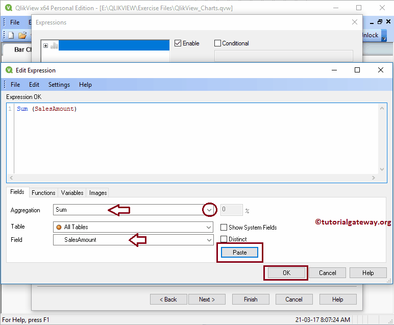 在这里,我们在“表达式确定”部分编写表达式。如果您不知道如何编写表达式,请选择“销售金额”字段,选择“求和”作为聚合,然后单击“粘贴”按钮。