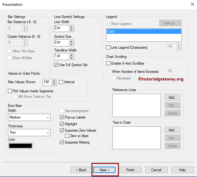 在这里,更改 QlikView 折线图的“表现”。例如,我们可以更改条形图设置、启用滚动轴等。