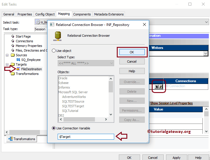 请链接Start Task(开始任务)和Session Task(会话任务)。接下来,双击Session task(会话任务)将打开Edit Tasks(编辑任务)窗口。在Properties(属性)选项卡中,我们配置了$Target connection value(目标连接值)。此属性将关系源信息存储在$Target变量中。