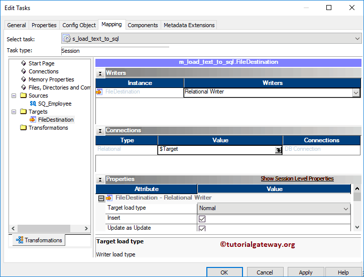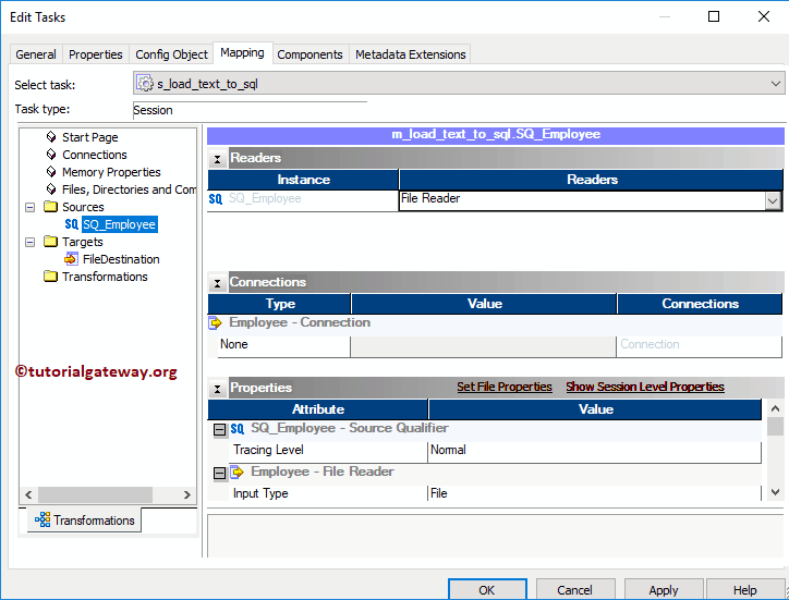 一旦我们创建了Informatica从文本文件加载数据到SQL Server的工作流,下一步就是为我们的映射创建一个会话任务。