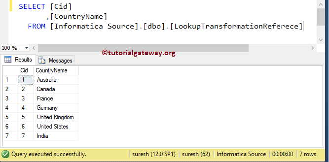 在此 Informatica 查找转换示例中,我们的任务是将源表中的国家名称与查找表进行比较,然后