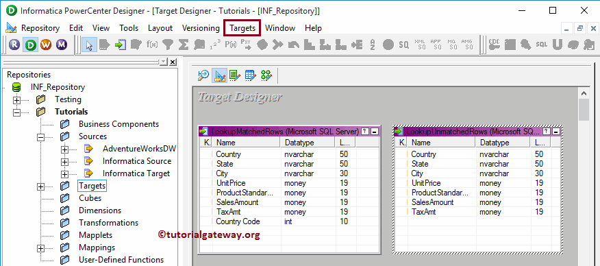 请导航到目标设计器并定义目标。在此 Informatica 查找转换示例中,我们使用已创建的 SQL 表([查找匹配行] 和 [查找不匹配行])作为我们的目标定义。请参阅使用源定义创建 Informatica 目标表以了解创建目标定义涉及的步骤。