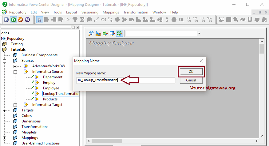 在这里,您需要为此映射(m_Lookup_Transformation)输入一个唯一的名称,然后单击“确定”按钮。