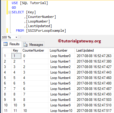让我打开 SQL Server Management Studio,并检查我们是否通过 For 循环容器将多个计数器值的记录插入了目标表中。