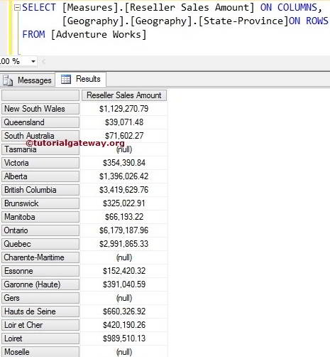 SELECT {[Measures].[Reseller Sales Amount]} ON COLUMNS,