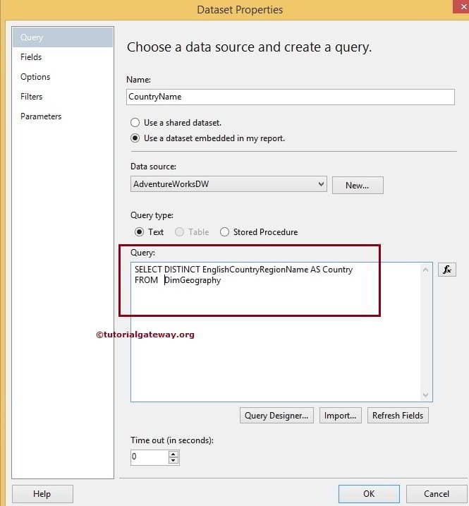 在开始创建国家参数之前。让我们在“报表数据”选项卡中创建一个数据集。首先,我们创建了一个嵌入式数据集,其中包含 [AdventureWorksDW2014] 数据库中 [DimGeography] 表的唯一国家名称。
