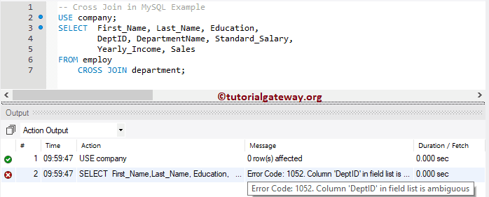 从下面的截图可以看到,它抛出了一个错误:歧义列 DeptID。这是因为 DeptID 列同时存在于两个表中,而交叉连接查询不知道您要求它显示哪个列。