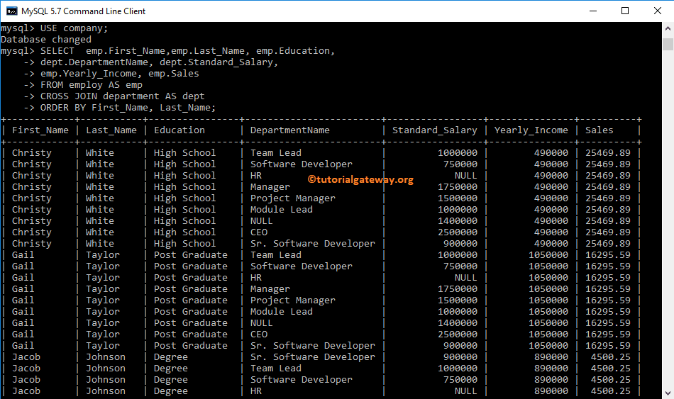 让我向您展示如何使用命令提示符编写此查询。在此交叉连接示例中,我们向您展示了如何将其与 ORDER BY 子句一起使用。我建议您参考“ORDER BY”文章。