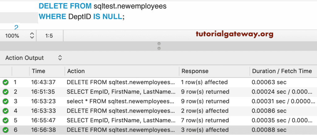 此查询删除部门 ID 为 NULL 的行。您可以使用 IS NOT NULL 尝试删除 ID 不为 NULL 的行。