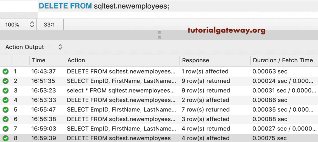 从下面的屏幕截图可以看出,它删除了所有部门 ID = 1 的员工。