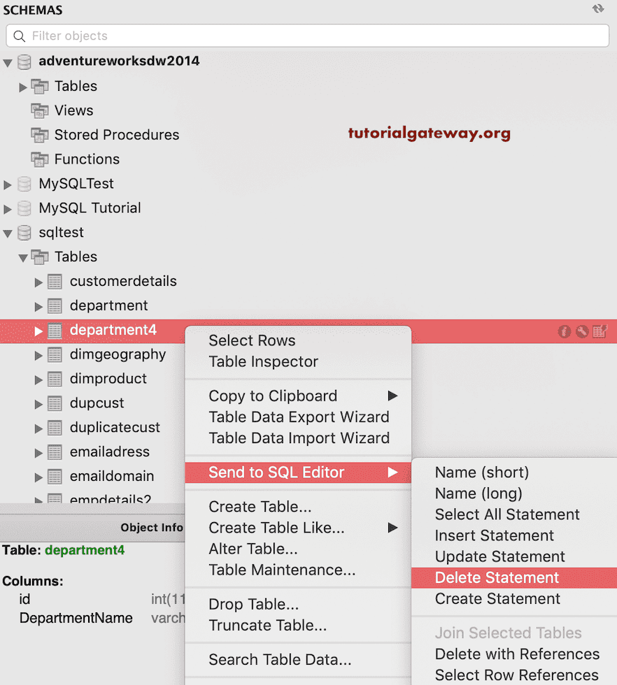 如果您可以访问 MySQL Workbench,您可以选择要执行删除操作的表。接下来,选择“发送到 SQL 编辑器”,然后选择下面显示的选项。