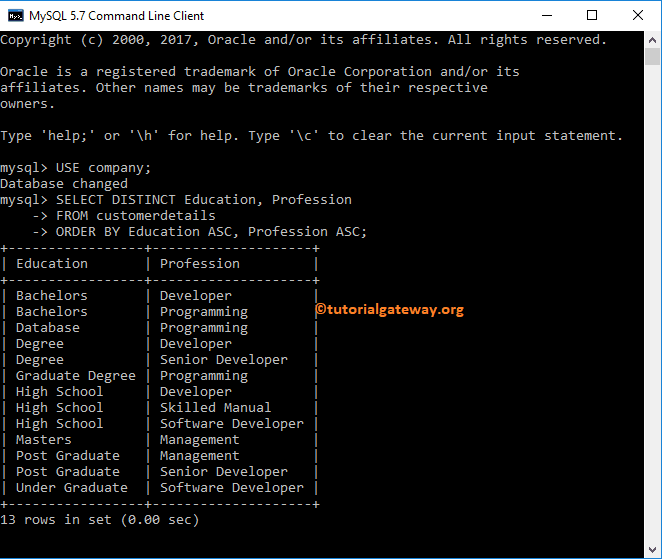 让我向您展示如何在命令提示符中使用 Order By 子句选择不同的记录。在这里,我们从 customer 详细信息列中选择不同的 Education 和 profession 记录。