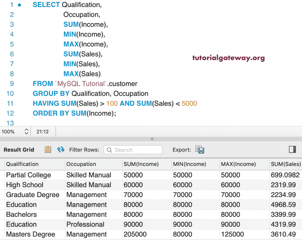 在此示例中,我们将单个列用作 GROUP 列,并使用 SUM 函数 来聚合值。接下来,我们使用 HAVING 子句来限制结果。 在此,GROUP BY 语句按学历对客户进行分组。然后,它检查收入总和是否大于 100000。