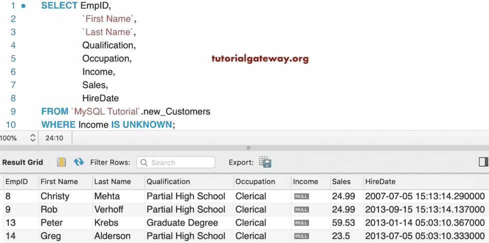 在这里,我们使用了 IS 和 Unknown 关键字。下面的 IS 运算符代码选择了收入为 Null 的员工。