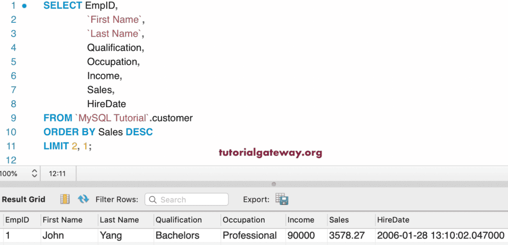 以下 limit 查询按收入降序对客户进行排序。接下来,它打印第 3 行。这意味着收入排在第三位的客户。