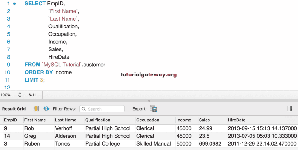 默认情况下,MySQL 表数据将按索引值排序。要检索收入或销售额最高的三位客户,您必须使用 ORDER BY 对数据进行排序。接下来,使用它来获取前三名客户。