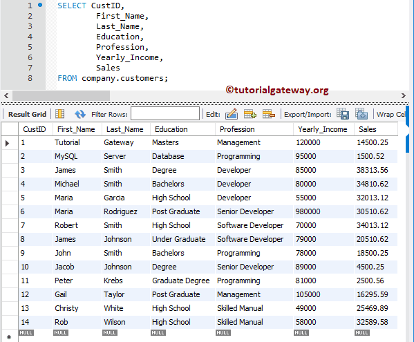 上面的 SELECT 语句从 MySQL Customers 表中检索所有教育程度为 High School 或职业为 Developer 的客户(WHERE 子句)。