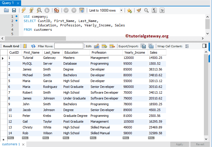 在这个 MySQL 示例中,我们将使用 Yearly Income(年收入)按升序对数据进行排序。请将 Yearly Income 替换为 表 中所需的任何列。