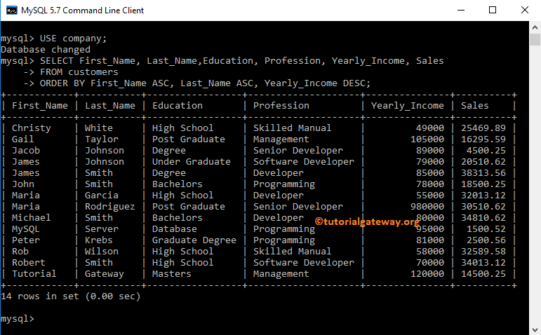 让我向您展示如何使用命令提示符对记录进行排序。在此 Order by 示例中,我们按 First Name(名字)和 Last Name(姓氏)升序排序,然后按 Yearly Income(年收入)降序排序。