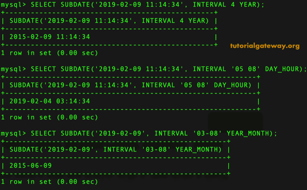 - 在第三个语句中,我们减去了 3 年和 8 个月。参考 DATE_SUB