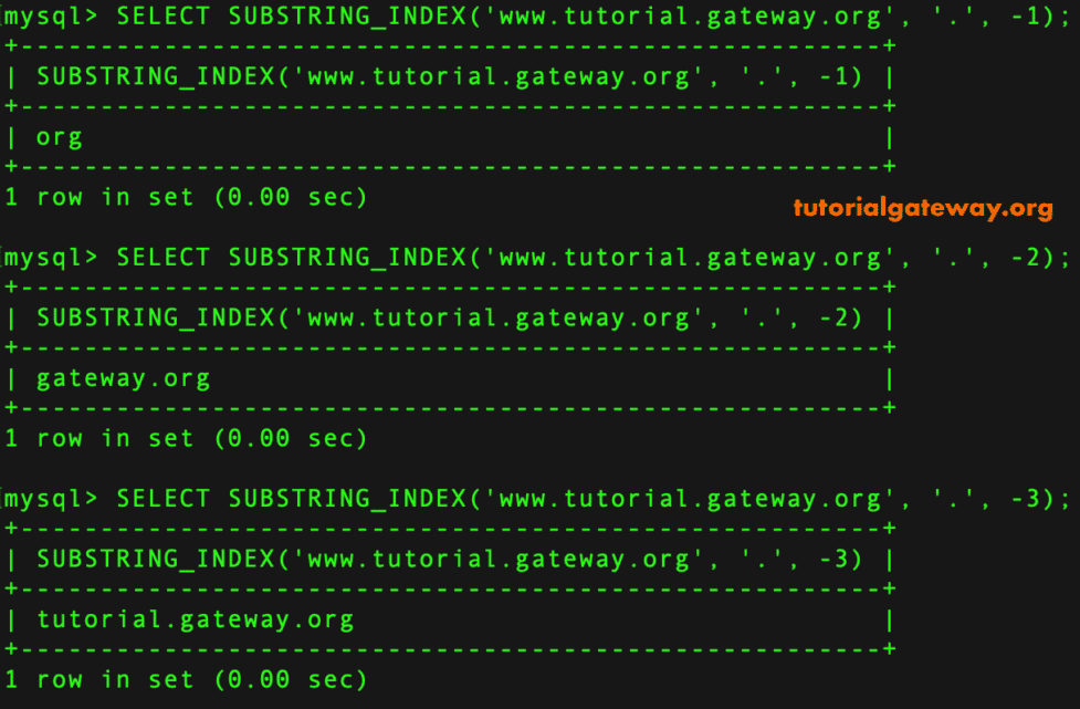 SELECT SUBSTRING_INDEX('www.tutorial.gateway.org', '.', -3);