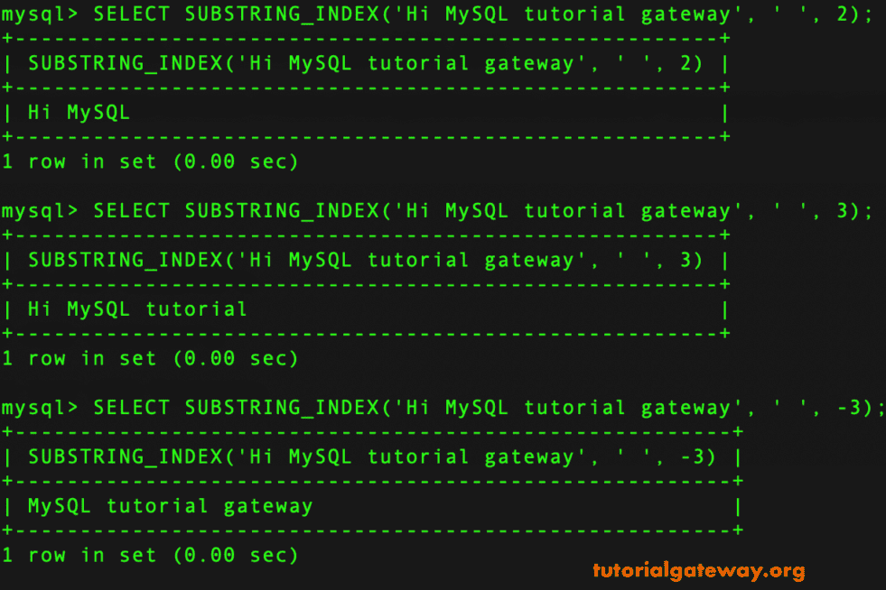SELECT SUBSTRING_INDEX('Hi MySQL tutorial gateway', ' ', -3);