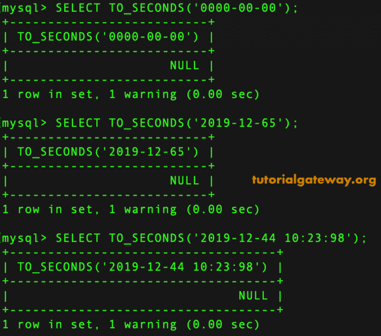 在此 日期函数 查询中,我们将 NOW、CURDATE 和 UTC_TIMESTAMP 与一些加法运算一起用于 TO_SECONDS 函数中。这意味着我们将日期时间值以 MySQL 字符串格式使用。