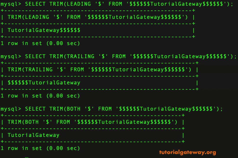 SELECT TRIM(LEADING '$' FROM '$$$$$$TutorialGateway$$$$$$');