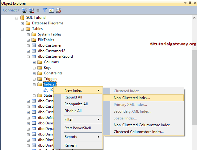 为此,请转到对象资源管理器并展开“数据库”文件夹。接下来,请展开要创建的表,右键单击“索引”文件夹将打开上下文菜单。请选择“新建”,然后选择“非聚集”。