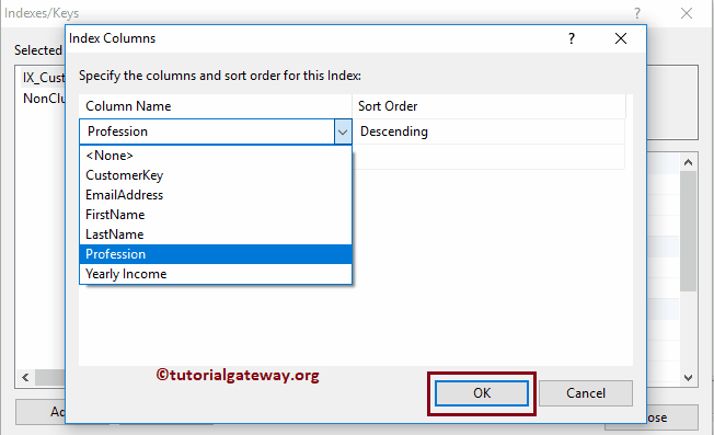 CREATE NONCLUSTERED INDEX IX_CustomerRecord_ProfessionIncome ON CustomerRecord ([Profession] DESC, [Yearly Income] ASC)