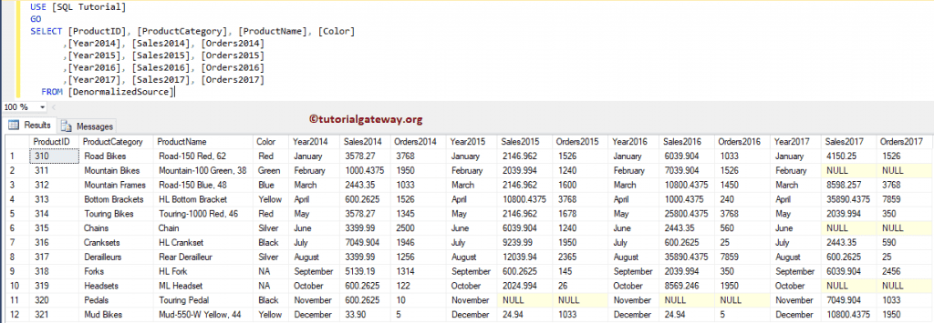 对于此 Informatica Normalizer 转换示例,我们将使用以下数据显示(非规范化源表)